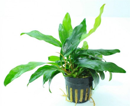 Anubias minima Familie: Araceae land: West Afrika Hoogte: 40 cm Licht: Weinig/Normaal Temperatuur: 22-26ºC Water hardheid: Zacht/Medium pH: 5-9 Plaats: Middenzone Omschrijving: Moerasplant plant met donkergroene sterke bladeren. Deze plant is uitermate geschikt voor op decoratie materiaal zoals hout of stenen. Hij is geschikt om in het midden van het aquarium te plaatsen. Een weinig eisende plant met sterke bladeren en daarom ook geschikt voor bij vissen die nog wel eens van planten willen eten.