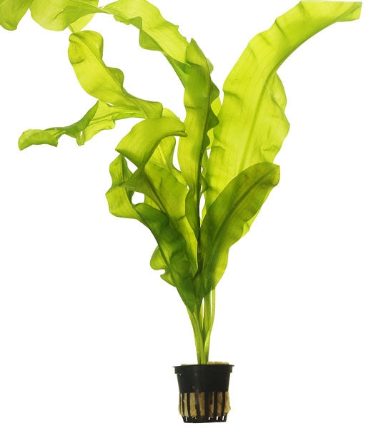 Aponogeton ulvaceus Land: Madagaskar Hoogte: 50 cm Licht: Normaal Temperatuur: 24-28ºC Water hardheid: Zacht/Hard pH: 5-8 Omschrijving: Waterplant met tot 3 cm dikke knol. Bladsteel tot 50 cm lang, bladschijf lintvormig, teer, gegolfd, gedraaiden 2-8 cm breed. De kleur is lichtgroen. De Aponogeton ulvaceus is een veel aangeboden en begeerde plant. De cultuur is makkelijk maar heeft in het aquarium wel een voedselrijke bodem nodig. Deze plant kan wel tot 30-40 bladeren maken.