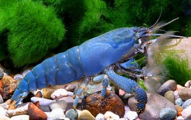 Middelgrote waaierhandgarnaal, blauw van kleur. Deze garnaal is zeer vriendelijk tegen andere dieren.