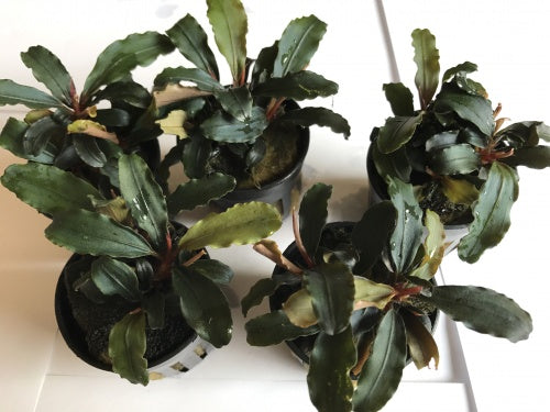 De geweldige Bucephalandra planten uit Borneo zijn vrij nieuw Ze hebben niet veel licht nodig. Je kunt ze zowel op hout of op stenen bevestigen. Ze zijn langzaam groeiend en ze kunnen op de voorgrond.
