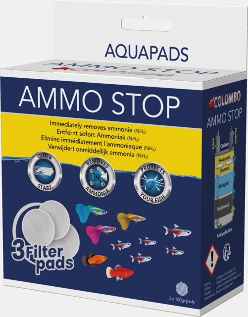 Colombo Ammo Stop beschermt uw vissen door giftige AMMONIA sneller te verwijderen dan enig ander product op de markt. Het unieke ronde ontwerp van de PADS zorgt voor een onbelemmerde doorstroming in het filter, wat essentieel is voor de Bacteriebevolking en gaat tot 12 weken mee. Ammo Stop kan gebruikt worden in combinatie met onze Nitro en Posho pads en is geschikt voor zowel tropische als koudwater aquaria.