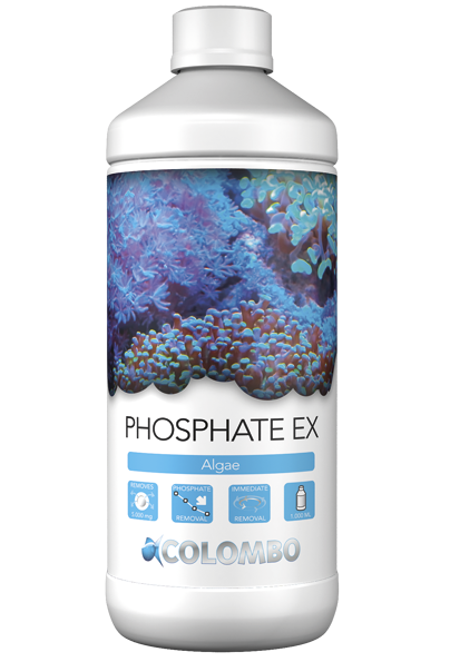 Colombo marine algae phosphate ex 1000 ml Productomschrijving Nitraat en Fosaat zijn voedingsstoffen voor algen. Colombo Marine Algae - Phosphate Ex zorgt ervoor dat fosfaten gemakkelijk verwijderd worden. Door middel van één dosering kan de gewenste hoeveelheid fosfaat direct worden verwijderd. Er moet 1 ml Phosphate Ex worden toegevoegd om 5 mg fosfaat te verwijderen. Dit product is verkrijgbaar in een 500 ml en 1000 ml variant