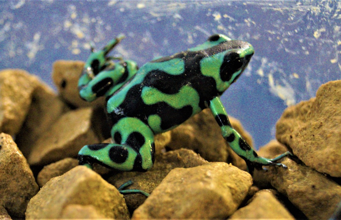 Dendrobates Auratus De kikkers zijn 25-40mm groot met uitzondering van een Panamese hoogland variant die tot 55mm groot wordt. De meest bekende kleurvorm van deze kikker is groen met grote zwarte vlekken, maar er zijn vele kleurvarianten bekend. De metalic groene kleur maakt bij sommige varianten plaats voor blauw, blauwgroen, geel, wit, grijs of goudkleurig. De zwarte vlekken kunnen zodanig met elkaar verbonden zijn dat er zeer kleine gekleurde stippen of een aantal gekleurde banden overblijven. De zwarte vlekken kunnen bovendien chocolade bruin zijn. Geografische variatie: De meest algemeen voorkomende groene variant wordt gevonden van Nicaragua tot in de Choco regio van Colombia. Deze populaties wijken echter allemaal iets van elkaar af in de groentint (mintgroen tot blauwgroen) en de proportie van zwart of chocolade bruin die de gekleurde vlekken terug kunnen dringen tot een aantal vlekken of banden. Op de Bocas del Toro is de groene kleur tot op meer dan 50% door zwarte vlekken terug gedrongen. Op het eiland Tobago en centraal Panama komen goudgekleurde varianten voor. Op Hawaï is een gouden kleurvorm geïntroduceerd. Eilanden in het Panama kanaal herbergen chocolade bruine kikkers met goudkleurige stippen. Grijs bruin en grijs met zwarte kleurvarianten komen voor in San Blas en Cerro Campana National Park. De blauwe kleurvorm komen alleen voor in Panama.