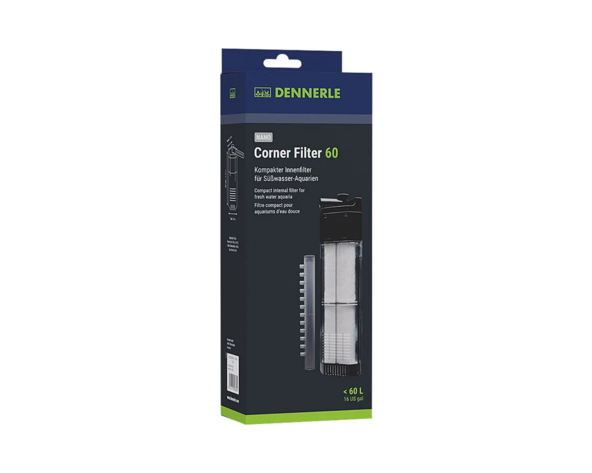 Nano-hoekfilter 60: Het filter beschikt over twee filterelementen. Voordeel: bij het reinigen of vervangen van een filterelement blijft het andere filterelement altijd volledig biologisch actief en zorgt voor een gelijkblijvende hoge waterkwaliteit geschikt voor aquariuminhoud 30 - 60 l Binnenfilter voor miniaquaria ◾ Krachtig, stil, compact ◾ Groot oppervlak voor filterbacteriën ◾ Veilig voor garnalen en kreeften Het nano-hoekfilter is krachtig met een pompcapaciteit van 150 l/uur. Daarbij loopt de pomp zo rustig en stil dat hij praktisch niet te horen is. En ook het stroomverbruik mag gezien worden: slechts 2 watt – dat ontziet de natuurlijke hulpbronnen. De waterdoorstroming kan traploos worden ingesteld en de waterstroom kan door de met 90 graden draaibare filteruitlaat in elke gewenste richting worden geleid. Het filter beschikt over een sproeibuis met geïntegreerde reinigingsschuif en een miniborsteltje voor het gemakkelijk schoonmaken van de sproeiopeningen. Dankzij de smalle aanzuigopeningen en een voorfilterspons met zeer fijne poriën is het nano-hoekfilter ook veilig voor jonge garnalen. Het reinigen van het filterelement is kinderlijk eenvoudig: het filter gewoon aan de uitstroombuis vastpakken en er naar voren toe uittrekken. De achterste helft van het filterhuis blijft in het aquarium. Was het filterelement in een schone emmer met aquariumwater uit, om de belangrijke filterbacteriën niet te beschadigen