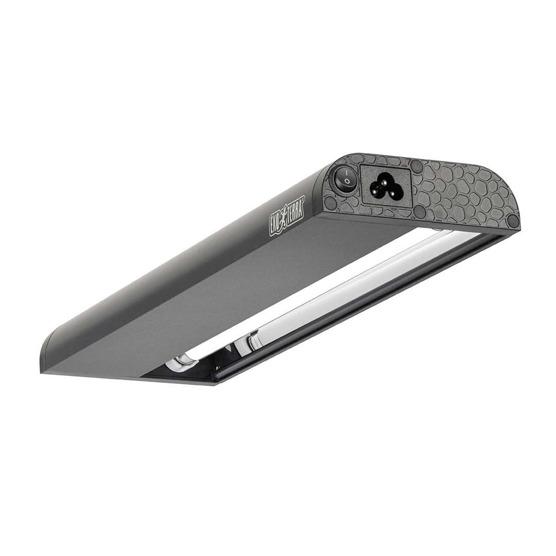 T5 Terrarium Top Hoogwaardige Reptielen UVB Armatuur Voor gebruik met de Exo Terra® Reptielen UVB VHO T5 Lamp Sterk gepolijste reflector verhoogt de lampoutput 2,5 keer Hoogwaardige elektronische ballast Maakt het mogelijk om tot 10 armaturen te koppelen Verhoogt de prestaties en levensduur van elke T5 VHO Lamp Kan eenvoudig bovenop elk terrarium worden geplaatst Geen flikkering; vermindert stress bij reptielen en amfibieën Verbeterde UVB penetratieafstand