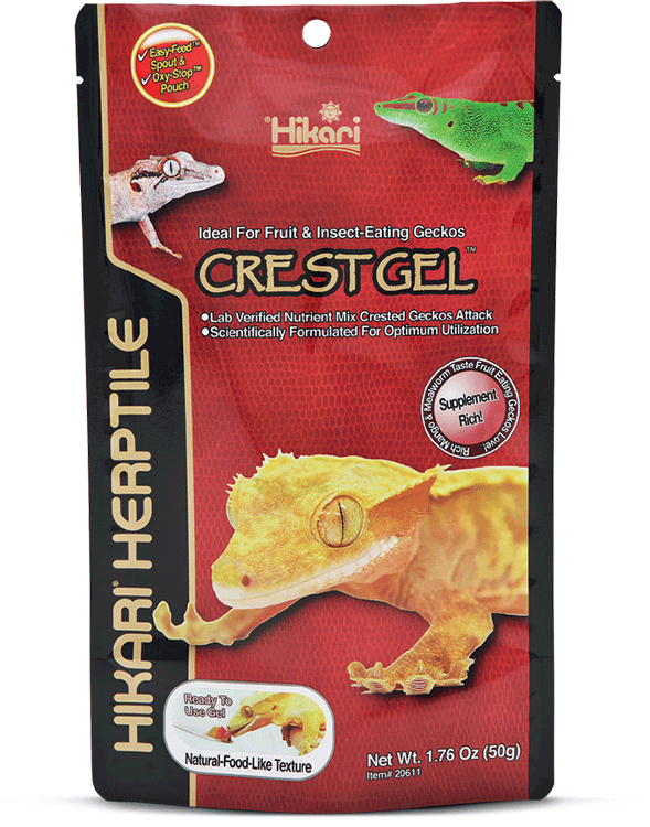 Onweerstaanbare kant en klare pasta voor fruit en insectenetende gekko’s.Hikari Reptile CrestGel is een wetenschappelijk geformuleerd, uniek uitgebalanceerd, klaar voor gebruik pasta dieet met speciale “Oxy-Stop” verpakking. Het bevat alle benodigde voedingsstoffen, vitamines, aminozuren en sporenelementen voor fruit en insectenetende gekko’s, zoals de kuif gekko. Hiermee kunnen ze een lang en gezond leven leiden. Netto gewicht: 50 gram Geschikt voor: CrestGel is het ideale voer voor rhacodactylusgekko’s zoals de Wimpergekko, Rhacodactylus, Reuzengekko etc., die inheems zijn op het eiland Nieuw-Caledonië. Het kan ook gebruikt worden voor andere fruit- en insectenetende reptielen zoals de Daggekko. Voedingsadvies: Breng de gewenste hoeveelheid voedsel aan op een voedingslepel of in een voederschaal. Voer laat op de dag omdat de Kuifgekko’s ‘s nachts het meest actief zijn. Verwijder altijd eventueel overgebleven voer na het voeren om besmetting of bederf te vermijden. Na opening in de koelkast bewaren en de inhoud van de verpakking binnen ongeveer 30 dagen gebruiken om versheid te garanderen. Niet met de vingers aanraken, gebruik altijd schone handschoenen of een pincet. Ingredienten Mangopuree, meelworm, suiker, sojaolie, sojameel, xanthaangom, brouwers gedroogde gist, hele geplette zijderupspoppen, gedroogd zeewiermeel, citroenzuur, gedroogd fruitmeel (appel, peer, aardbei, mango, lychee, kiwi, bosbes, cranberry, framboos), geëxtraheerd zeewiermeel, cholinechloride, vitamine E-supplement, L-ascorbyl-2-polyfosfaat (gestabiliseerde vitamine C), d-calcium pantothenaat, ribofl avine, vitamine A-supplement, thiamine-mononitraat, pyridoxine-hydrochloride, niacine, foliumzuur, vitamine D3-supplement, biotine, calciumcarbonaat, mononatriumfosfaat, ferrosulfaat, magnesiumsulfaat, zinksulfaat, mangaansulfaat, kopersulfaat, calcium joderen.