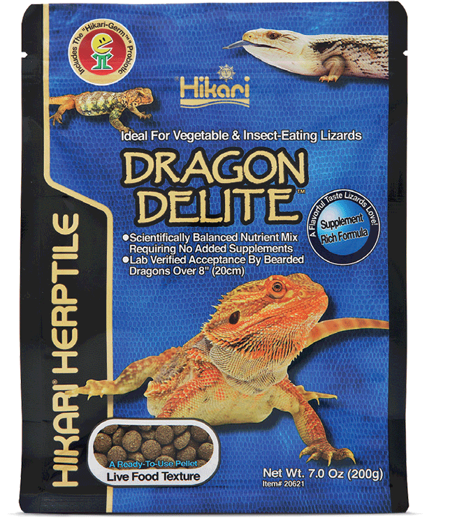Wetenschappelijk ontwikkeld gebalanceerd voer, geen toevoegingen meer nodig. Hikari Reptile DragonDelite is een uniek uitgebalanceerd korrelvoer met ingrediënten van insecten en planten met nauwkeurige niveaus van vitamines en mineralen, (vooral calcium) voor insecten en groenten etende hagedissen, zoals Baardagaam. De korrel is ontwikkeld om zacht te worden als het in water gedrenkt wordt en bootst de textuur van levend voedsel na. Geschikt voor: Ideale mix van voedingsstoffen en supplementen voor jong/volwassenen tot volwassenen (groter dan 20 cm) voor allesetende hagedissen die de voorkeur geven aan zowel insecten als plantaardige ingrediënten. Rijk aan plantaardige ingrediënten om aan de voedingeisen van volwassen Baardagame’s te voldoen. Voedingsadvies: Week elke korrel voor het voeren 3-5 minuten in zuiver, vers water tot de textuur er een is waar uw reptiel de voorkeur aan geeft. Voer voor jongvolwassen hagedissen (20-40cm) zoveel als zij willen. Voor volwassenen (groter dan 40 cm), voer één keer elke 2-3 dagen. Verwijder altijd het resterende voedsel na het voeren om besmetting of bederf te voorkomen. Na opening koel bewaren en binnen ongeveer 30 dagen gebruiken. Ingredienten Meelworm, gedroogde appelmeel, cassavezetmeel, tarwebloem, sojameel, gedehydrateerde luzernemeel, gedroogd bakkerijproduct, heel fijngemaakt zijderupspoppen, gedroogd zeewiermeel, Japanse mosterdspinazie, gedroogd Bacillus subtilis fermentatieproduct, gedroogde wortel, gedroogde pompoen, gedroogde tomaat, mulukhiya-maaltijd, cholinechloride, vitamine E-supplement, L-ascorbyl-2-polyfosfaat (gestabiliseerde vitamine C), d calcium pantothenaat, ribofl avine, vitamine A-supplement, thiamine-mononitraat, pyridoxinehydrochloride, niacine, foliumzuur, vitamine D3-supplement, biotine, calciumcarbonaat, mononatriumfosfaat, ferrosulfaat, magnesiumsulfaat, zinksulfaat, mangaansulfaat, kopersulfaat, calciumjodaat.