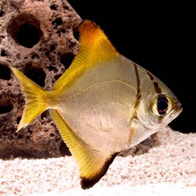 Naam: Monodactylus argenteus Nederlandse naam: Mono / zilverblad Maat: SM (5-6 cm) Herkomst: Afrika / Azie Temperatuur: 22-28 Ph: >7 Moeilijkheidsgraad: Kennis noodzakelijk Voeding: Alles