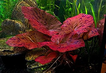Deze tijgerlotus vormt bladeren die variëren van helder groenrood met roodachtige vlekken tot een donkerder groenbruin met rode vlekken.