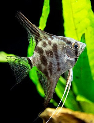 Naam: Pterophyllum scalare Nederlandse naam: Maanvis clown Maat: M ( 4-5 cm.) Herkomst: Peru Temperatuur: 24-28 Ph: <7 Moeilijkheidsgraad: Enige kennis noodzakelijk Voeding: vlees / alles