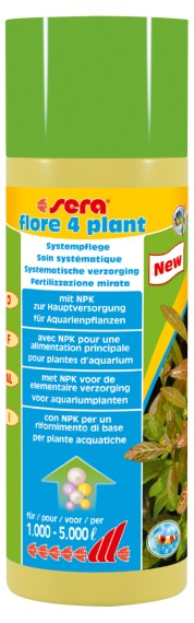 Voor een gezonde groei van waterplanten zijn de belangrijkste voedingsstoffen stikstof, fosfor en kalium van groot belang. Terwijl deze stoffen in aquariums met veel vissen via de uitwerpselen en voederresten voldoende beschikbaar zijn, is er aan macrovoedingsstoffen in plantenbakken met een gering (of zonder) dierenbestand vaak gebrek. Het gevolg is een slechte plantengroei. sera flore 4 plant werd ontwikkeld om de waterplanten in aquascapes en Hollandse bakken in een optimale verhouding gericht van stikstof, fosfor en kalium te voorzien – voor gezonde en krachtig groeiende planten. sera flore 4 plant is voor alle ongewervelde dieren goed te verdragen.