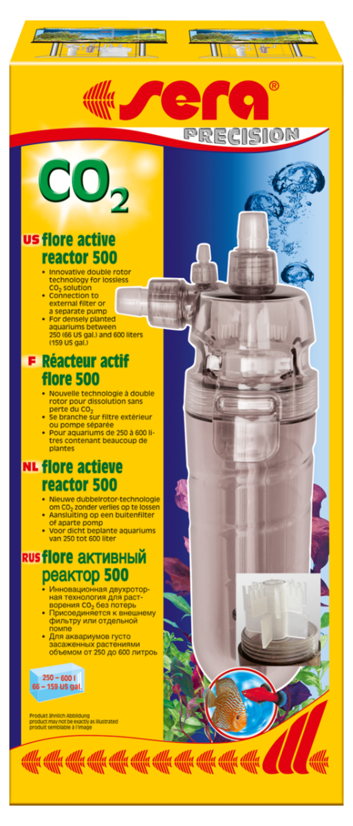 De sera flore actieve CO2-reactor wordt in een bestaand watercircuit (b.v. buitenfilter) geïntegreerd of kan alternatief via een pomp gebruikt worden. De rotoren zorgen voor een sterke vermenging van CO2 met het aquariumwater, zodat er honderden belletjes CO2 per minuut opgelost kunnen worden.