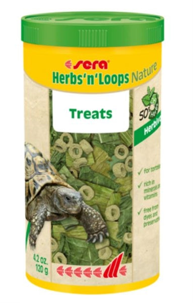 sera Herbs’n’Loops is het lekkere hapje van een mengsel van gedroogde kruiden (50%) en omzichtig vervaardigde loops voor landschildpadden en andere herbivore reptielen.