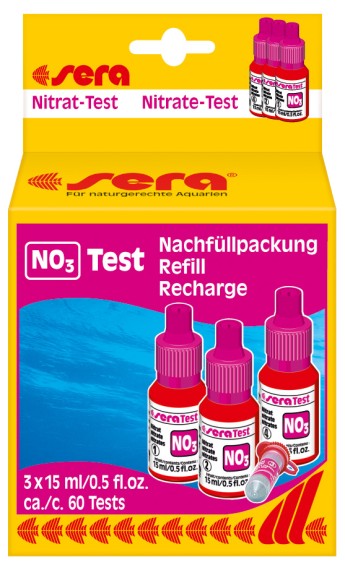 Voor deze test moet de bijgeleverde maatbeker met 20 ml aquariumwater gevuld worden, waarna er 6 druppels reageermiddel 1 in de maatbeker gedaan moeten worden. Vervolgens moet er een maatlepeltje reageerpoeder 2 aan de maatbeker toegevoegd worden. Dit mengsel moet eerst geschud worden, voordat er 6 druppels reageermiddel 3 in de maatbeker gedaan mogen worden. Vervolgens moet de maatbeker weer goed geschud worden, waarna dit geheel 5 minuten moet blijven staan alvorens met behulp van de kleurenschaal het nitraatgehalte bepaald kan worden