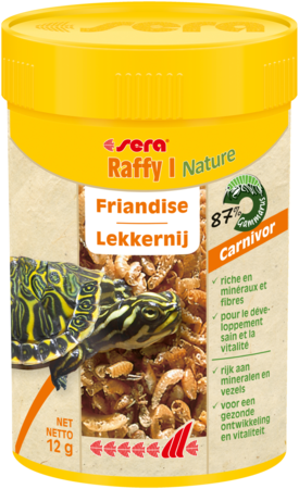 sera Raffy I is het lekkere hapje van zuivere, omzichtig gedroogde gammarus (87%), kleine vissen en krill voor waterschildpadden en andere (af en toe) vleesetende kleinere reptielen en amfibieën.