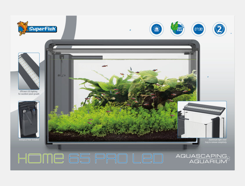 Eenvoudig onderhoud door de volledig verwijderbare LED bak en het ingebouwde Aqua-Flow filter, het filterhuis heeft ruimte de installatie van een optionele verwarming. De Home Pro Led verlichting kan worden bediend met een optionele Superfish LED CONTROLLER (A4020200) voor schakelen en dimmen.