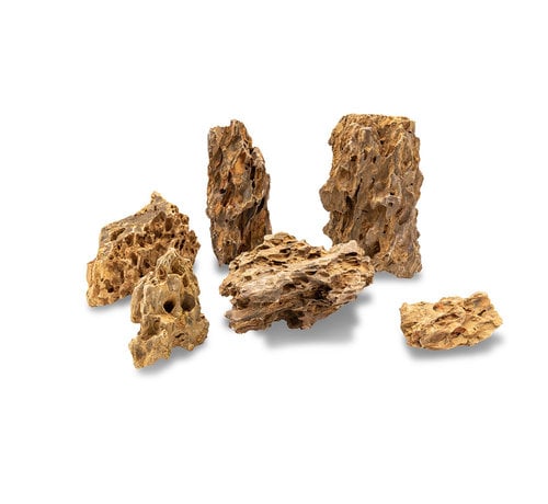 Dragon Stones, ook bekend "Ohko Stones," zijn populaire decoratieve stenen voor in het aquarium vanwege hun unieke en karakteristieke uiterlijk. Dragon Stones hebben een opvallend uiterlijk met onregelmatige vormen en uitgesproken texturen. Ze lijken op verweerd hout of gesteente met natuurlijke gaten en groeven. De stenen hebben vaak een aantrekkelijke mix van aardse kleuren, zoals bruin, beetje rood en beetje grijs.