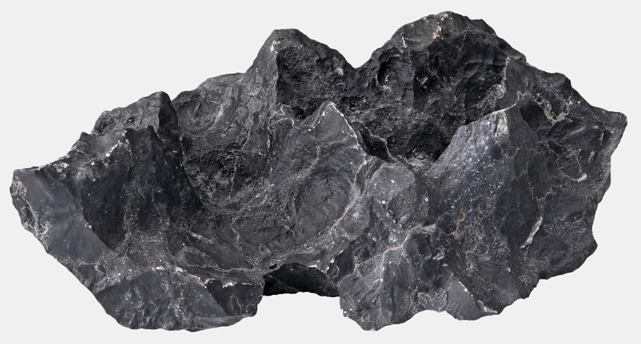 Diepzwarte grillige harde steen. Deze stenen zorgen voor een prachtig contrast met de felgroene beplanting. Deze steen verhardt het water enigzins.