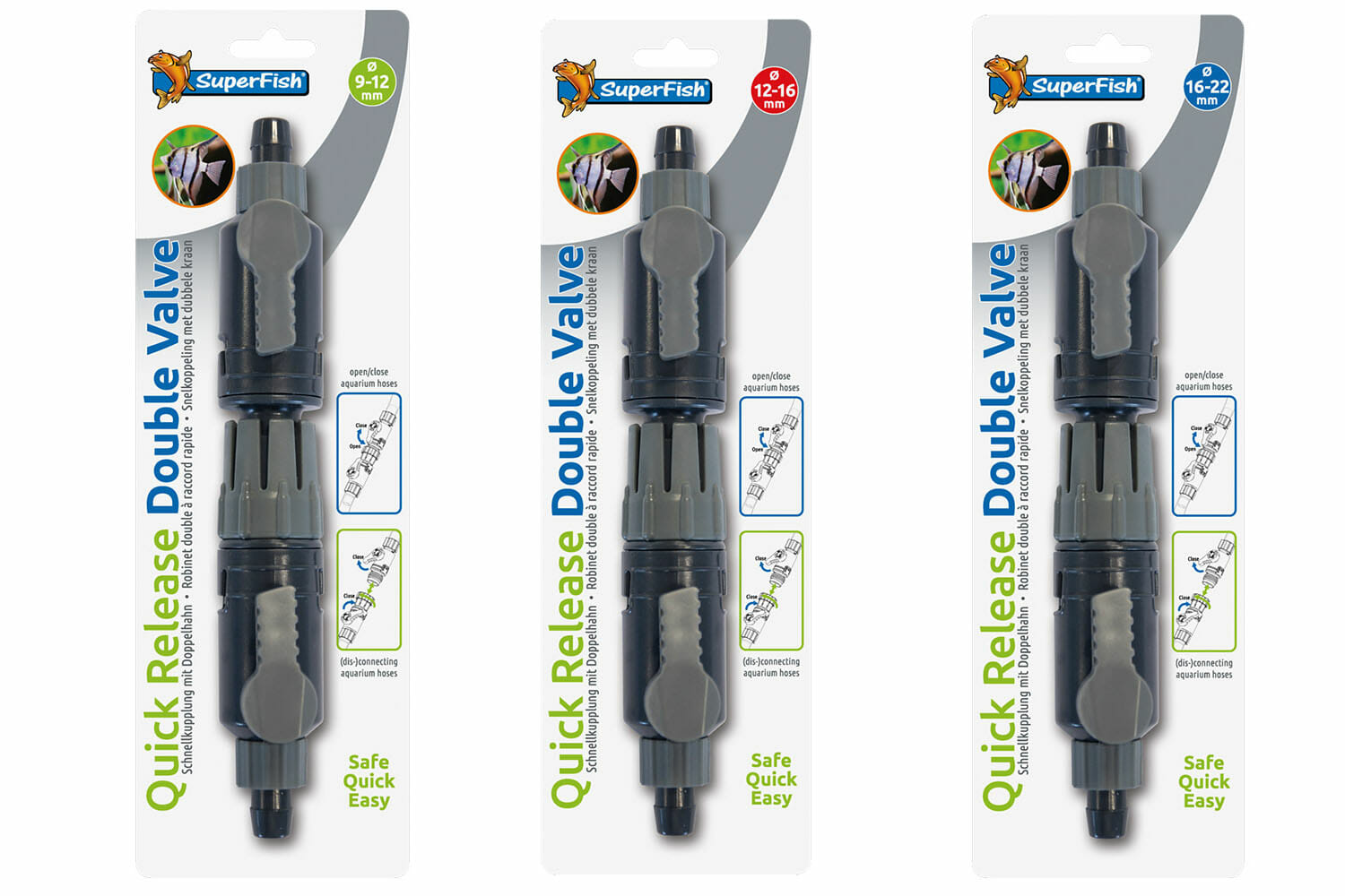De Superfish Dubbelkraan Snelkoppeling is verkrijgbaar voor de slangdiameters van 9-12, 12-16 en 16-22 mm. De verschillende maten van de Quick Release-kranen kunnen op elkaar worden aangesloten om te gebruiken als verloopstuk voor verschillende slangdiameters. Geschikt voor zowel zoet- en zeewateraquaria.